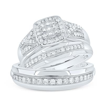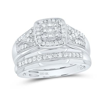 Celebrate your love with this elegant 10k Gold Round Diamond Square Matching Wedding Ring Set, available in Yellow Gold and White Gold. Featuring a brilliant 3/4 Cttw of sparkling round diamonds, each set includes an engagement ring and a perfectly coordinated wedding band.