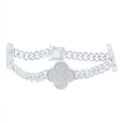 The product title is 3 CTW Nat Dia CN Cuban Clover Bracelet 7 Inch. This is a luxurious 7-inch bracelet that stands out with a significant total weight of 3 carats of natural diamonds. The design uniquely combines the bold presence of a Cuban link chain with elegant, diamond-set clover motifs, resulting in a striking and highly fashionable piece that offers maximum brilliance and sparkle.